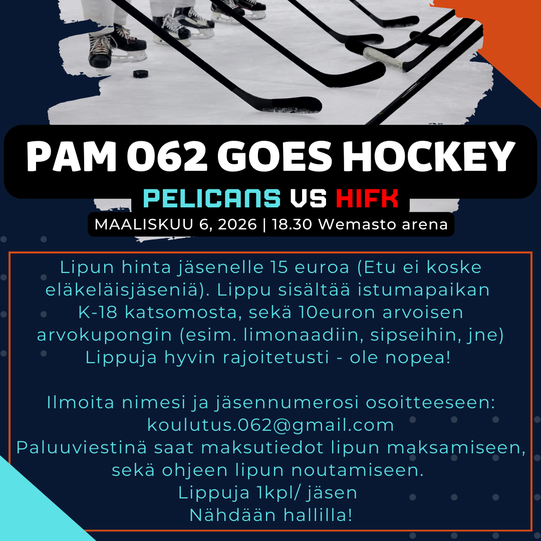 Paljon tykätty ja käytetty kulttuuri- ja hyvinvointietu voimassa myös vuonna 2026. Se on tarkoitettu osastomme PAM 062 jäsenmaksua maksaville jäsenille. Etua voi hakea kertaluonteisesti,…